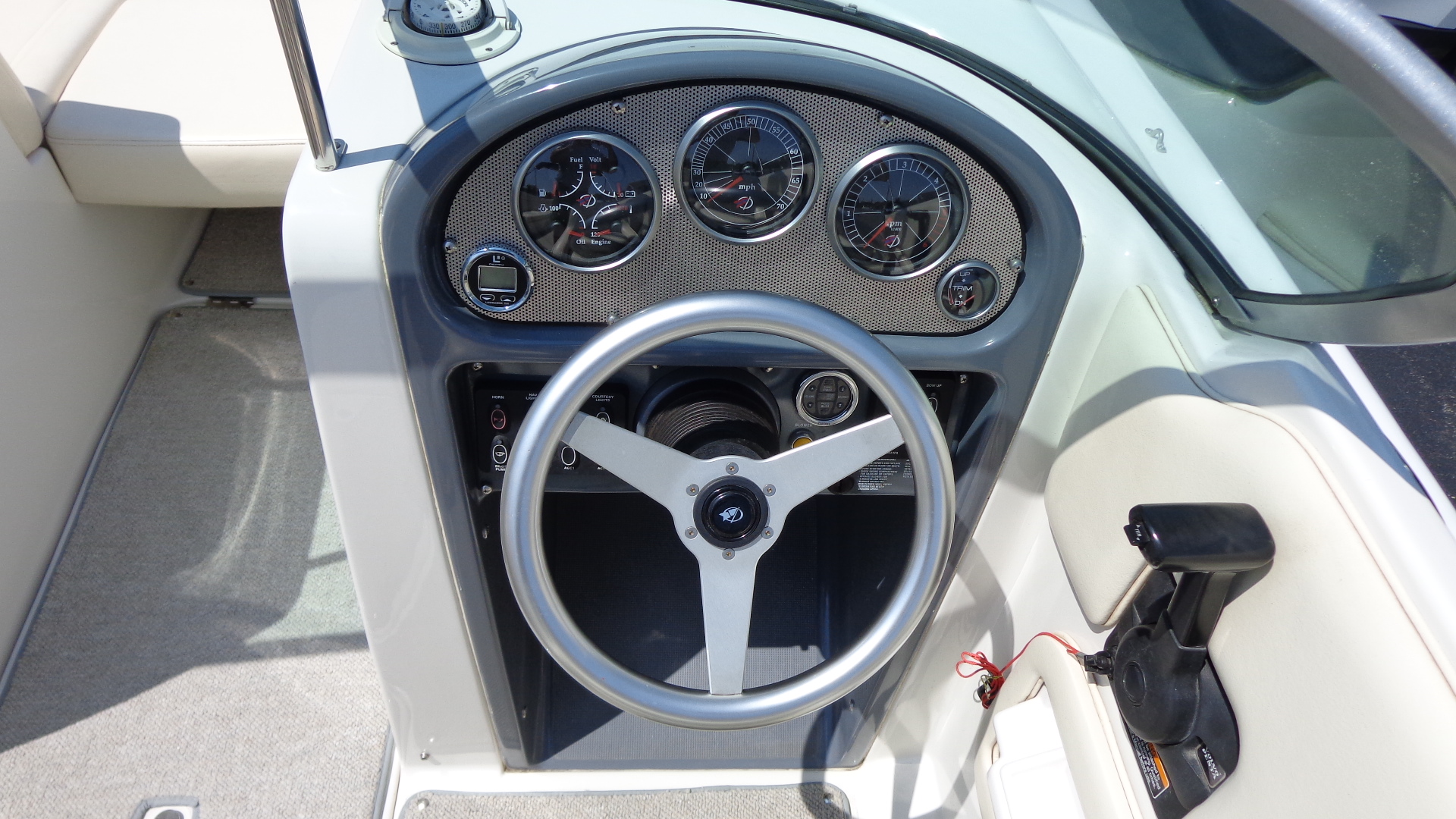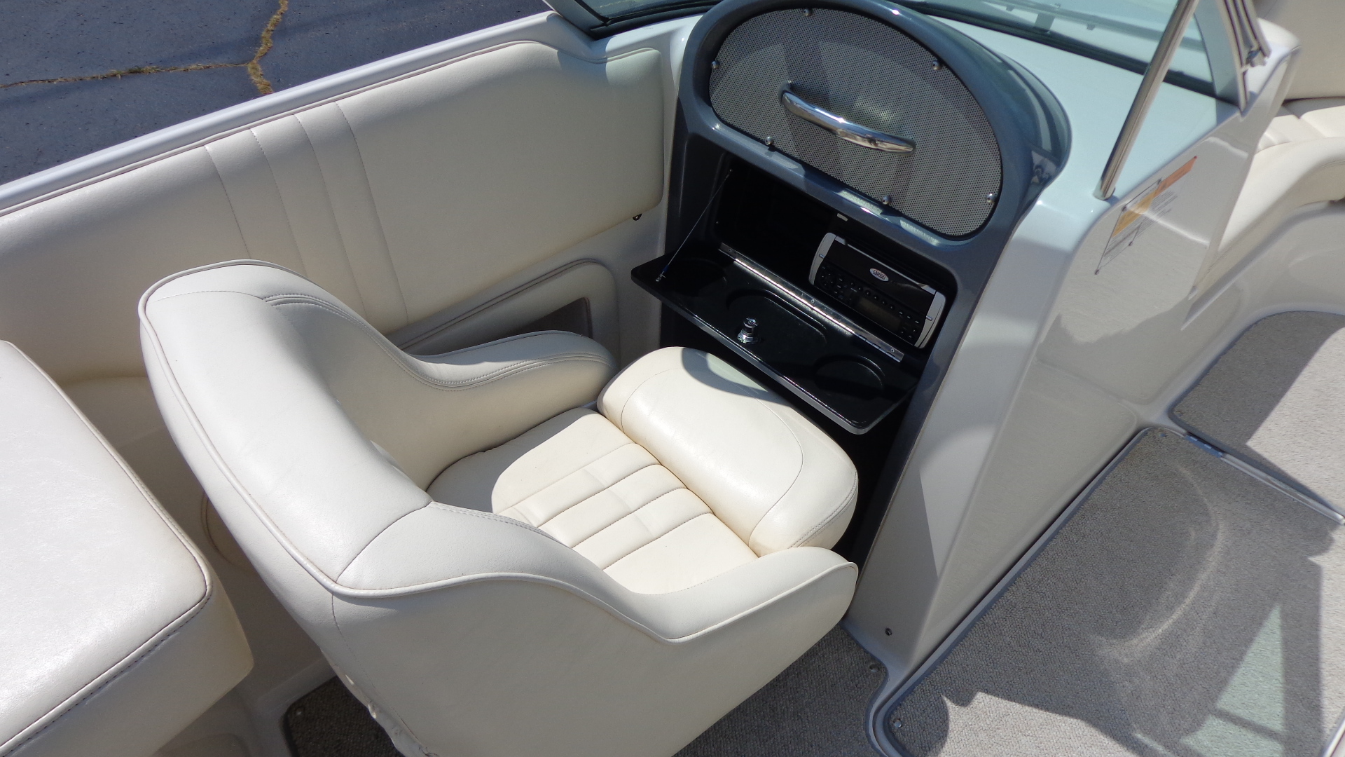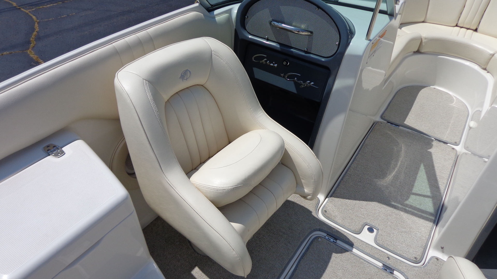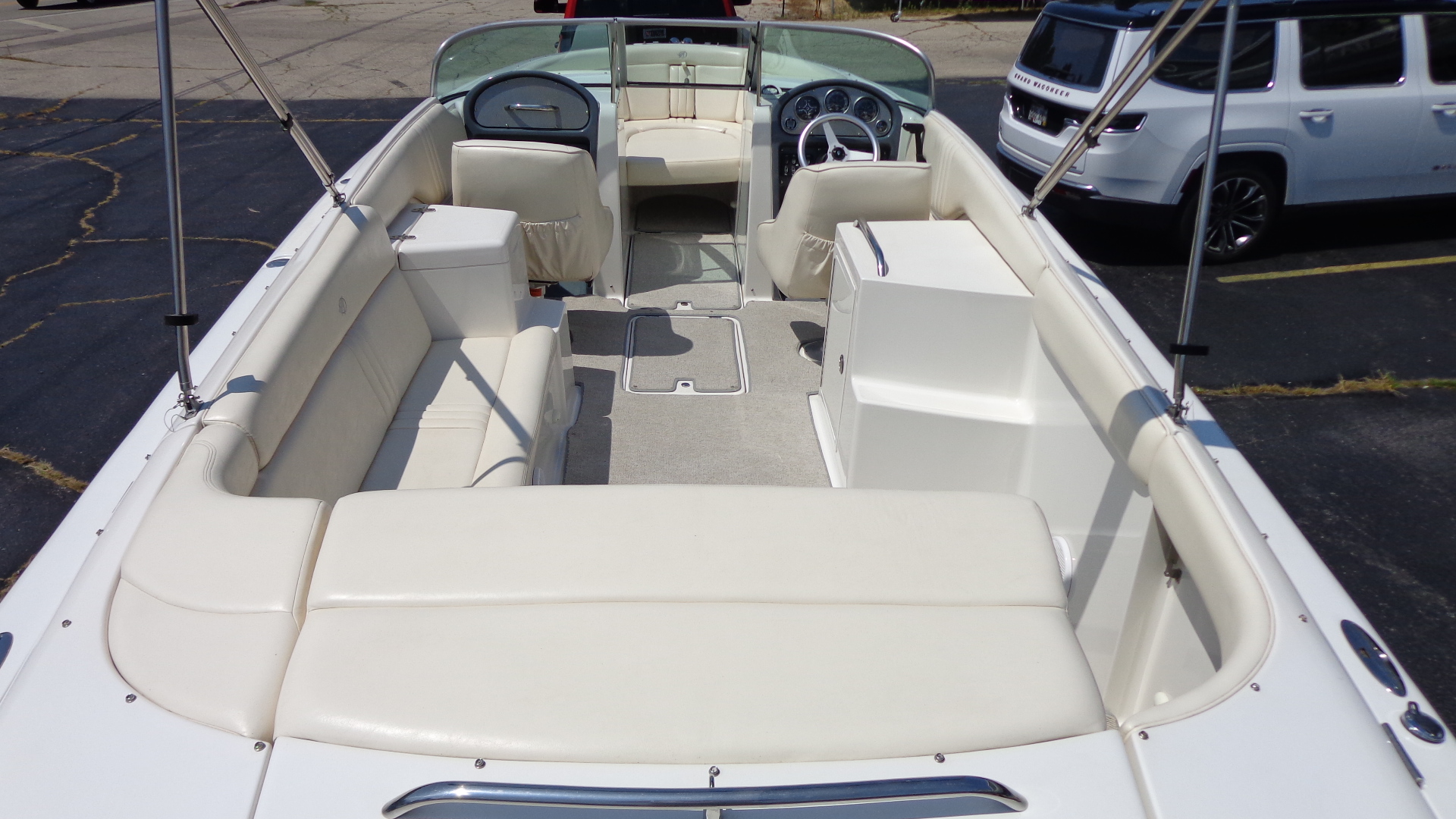 Comfort Upgrades: Snap-in marine carpet, dual swiveling captain’s chairs, and spacious open bow seating