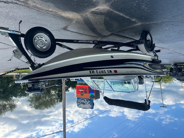Shoreland’r Single Axle Bunk Trailer with swing tongue for easy storage, spare tire with carrier, and load guides that make solo launching and trailering a breeze. It tracks well and handles the boat like a champ on the highway.