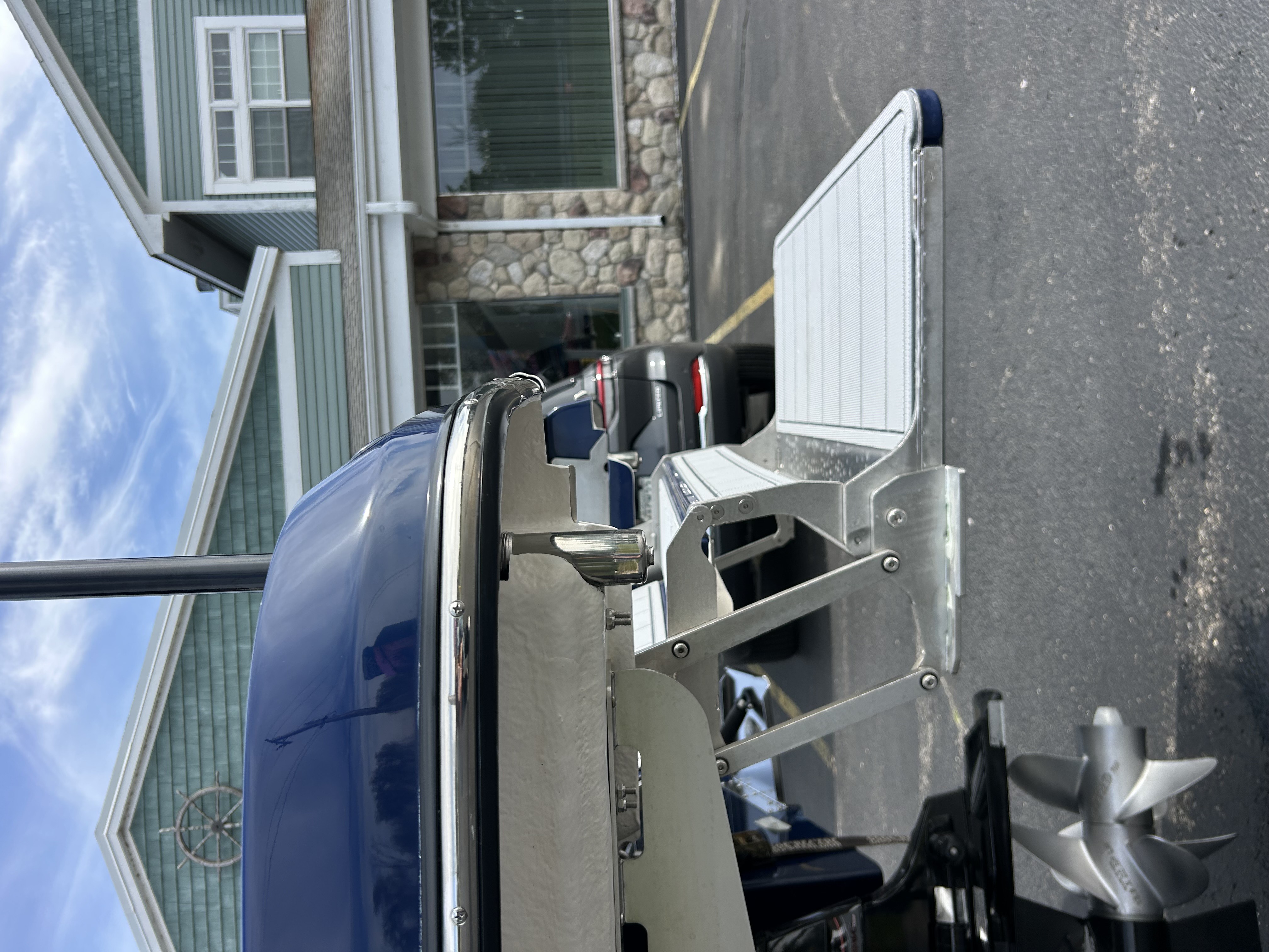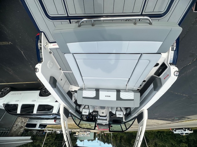 The EFXII Electric Folding Tower in white, paired with an integrated Bimini top (canvas and boot in blue), offers both style and shade, adapting effortlessly to your boating needs. Protect your investment with premium, custom, snap-on Aqualon bow and cockpit covers, designed for a perfect fit and lasting protection.