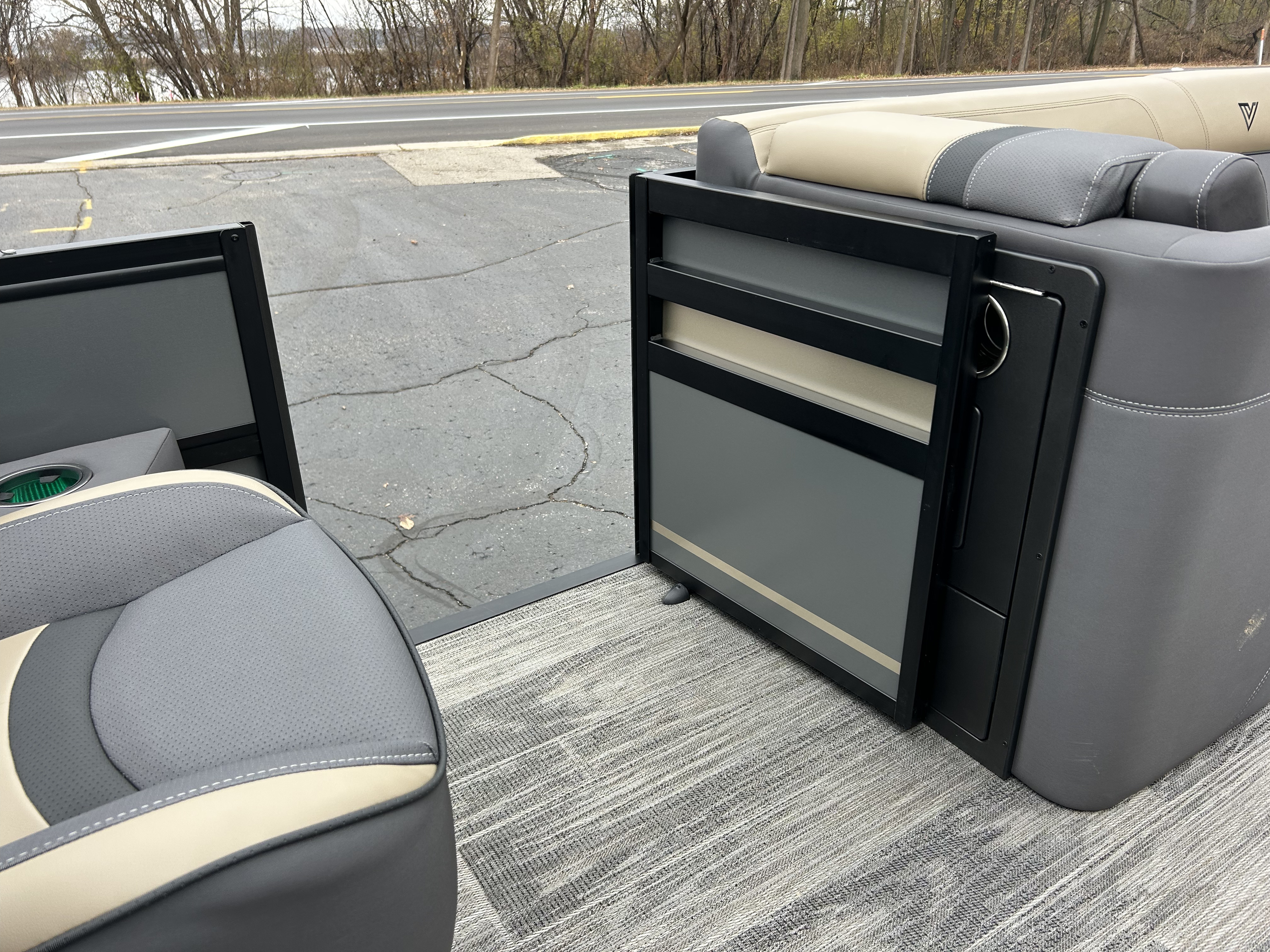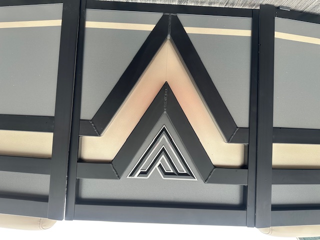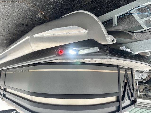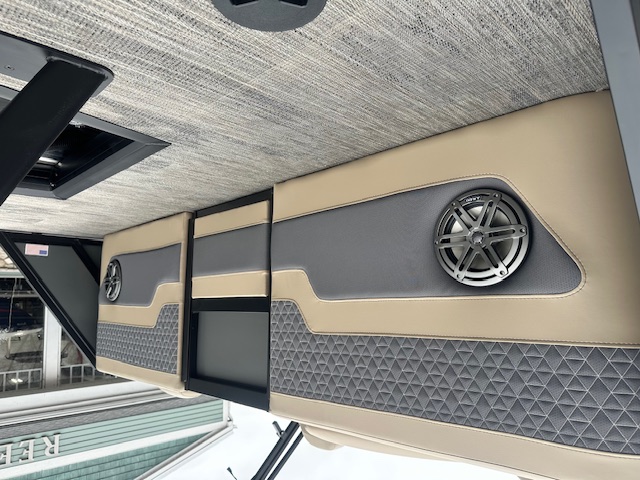 The exterior turns heads with a Charcoal main color, accented by a Sandstorm Metallic stripe and sleek black 2" rails, giving it a bold, modern look at the dock. Overhead, the black-on-black power Bimini top deploys at the touch of a button, keeping you cool and comfortable all day long.