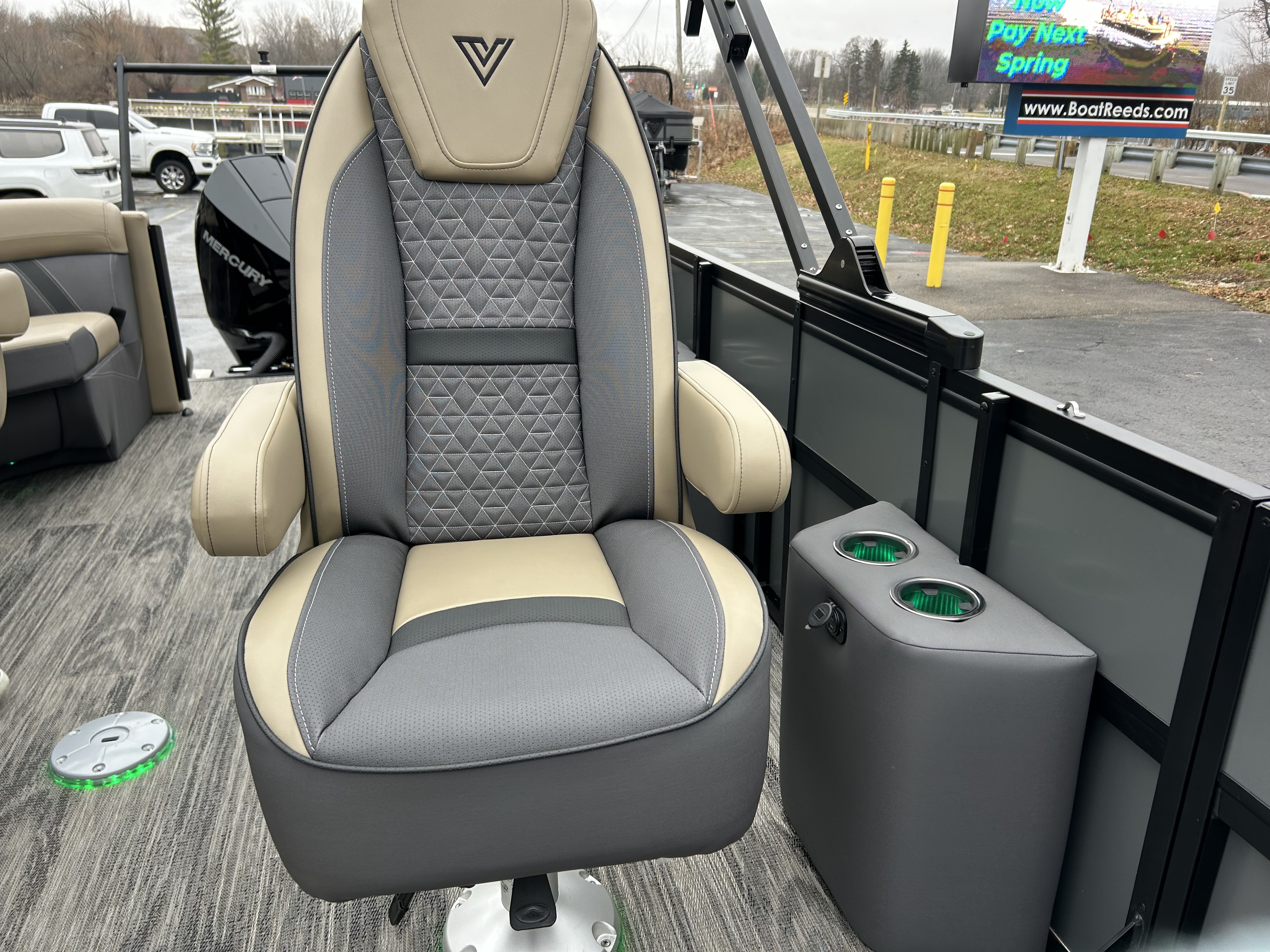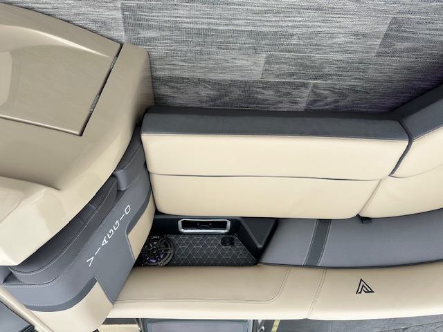 Step inside and you’ll find the boat’s true luxury. The interior is wrapped in rich Leon Truffle Night upholstery, paired beautifully with Lakeport Plank Shadow flooring—a high-class woodgrain look that’s as stylish as it is durable. Thoughtful features like center in-floor storage keep gear tucked away, while SeaStar power-assist steering makes handling feel light and precise.